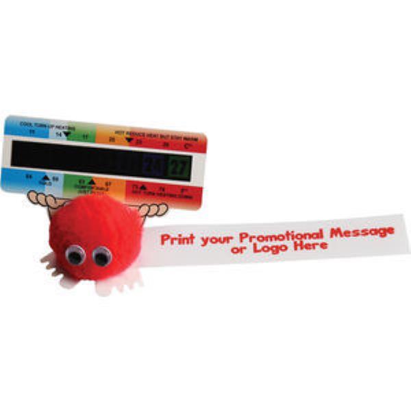 Cute Original Advertising Logobug holding a Temperature Gauge Card. Ideal giveaway that can be used in any home or office - with your artwork printed in full colour on Ribbon.