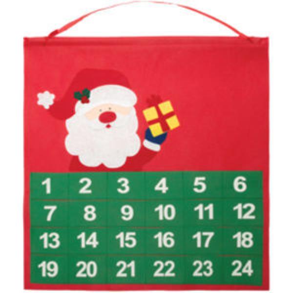 Felt Christmas advent calendar with 24 numbered pockets and Santa image detail.