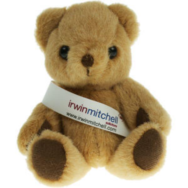 Jointed honey coloured soft feel plush bear with a full colour printed sash.