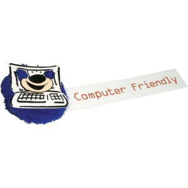 Computer Mophead Character with full colour printed ribbon and self adhesive base.