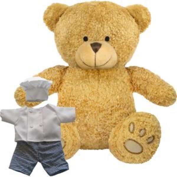 BLANK PLUSH SOFT TOY EDWARD II TEDDY BEAR with Chef Outfit. Suitable for All Ages, Machine Embroidered Paws & Facial Features, White Hat & Jacket, Gingham Trousers, Seated Height 22cm Approx, Golden Yellow Colour Fur - Available in Two Colours. Minimum Quantity: 10.
