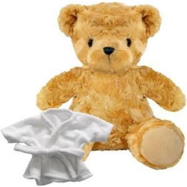 BLANK PLUSH SOFT TOY 19CM VICTORIA TEDDY BEAR with Dressing Gown. Victoria Plush Toy Bear Suitable for Age 3. has Luxurious Rose, Swirl Embossed Plush Fur & Glass Studded Eyes. White Robe with Tie Cord, Sitting Height 19cm Approx. Minimum Quantity: 10.