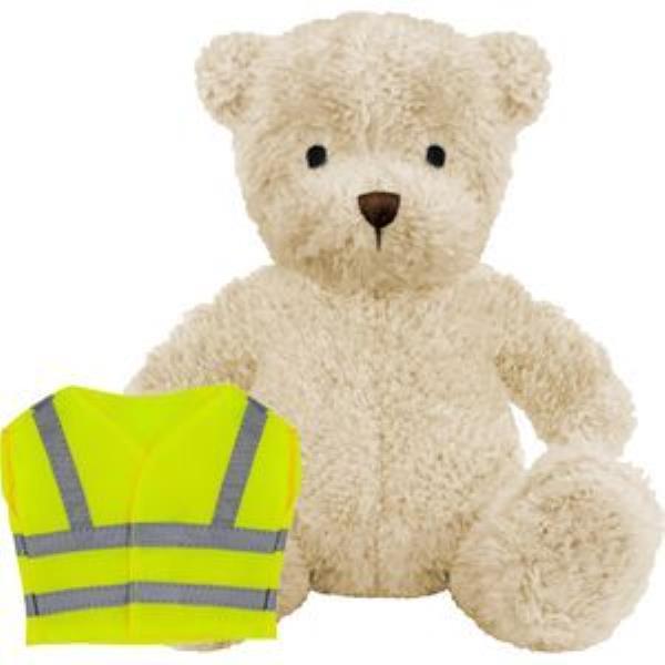 BLANK PLUSH SOFT TOY JAMES III TEDDY BEAR with Hi-vis Vest. James Iii Plush Toy Bear, Suitable for All Ages, Machine Embroidered Facial Features, Yellow with Silver Reflective Stripe, Seated Height 17cm Approx, White Colour Fur - Available in 3 Colours. Minimum Quantity: 10.