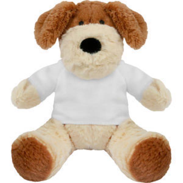 BLANK PLUSH SOFT TOY 20CM DARCY DOG with White Tee Shirt. Suitable for Sublimation & Tranfer Print, Darcy Dog Plush Toy Suitable for All Ages. with Machine Embroidered Eyes. Super Soft Luxury Fur, Sitting Height 20cm Approx - Available in 2 Sizes. Minimum Quantity: 10.