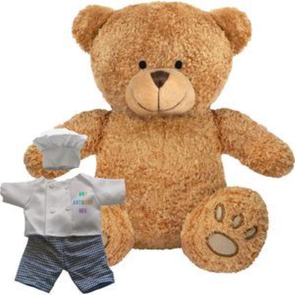 PRINTED PROMOTIONAL SOFT TOY EDWARD I TEDDY BEAR with Chef Outfit. Branded to Your Specification & Personalised in Full Colour. Suitable for All Ages, Machine Embroidered Paws & Facial Features, White Hat & Jacket, Gingham Trousers, Seated Height 22cm Approx, Brown Colour Fur - Available in Two Colours. Minimum Quantity: 10.