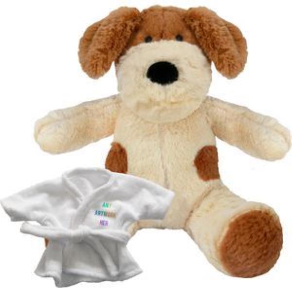 PRINTED PROMOTIONAL SOFT TOY 20CM DARCY DOG with Dressing Gown. Branded to Your Specification & Personalised in Full Colour. Darcy Dog Plush Toy Suitable for All Ages. with Machine Embroidered Eyes. White Robe with Tie Cord, Sitting Height 20cm Approx. Minimum Quantity: 10.