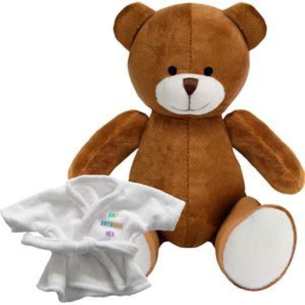 PRINTED PROMOTIONAL SOFT TOY RICHARD TEDDY BEAR with Dressing Gown. Branded to Your Specification & Personalised in Full Colour. Richard Plush Toy Bear, White Robe with Tie Cord, Suitable for All Ages, Machine Embroidered Facial Features, Seated Height 20cm Approx. Minimum Quantity: 10.
