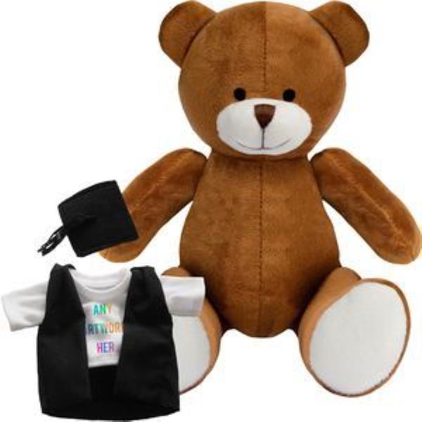PRINTED PROMOTIONAL SOFT TOY RICHARD TEDDY BEAR with Graduation Outfit. Branded to Your Specification & Personalised in Full Colour. Richard Plush Toy Bear, Black Mortar Board Cap & Graduate Gown, Suitable for All Ages, Machine Embroidered Facial Features, Seated Height 20cm Approx. Minimum Quantity: 10.