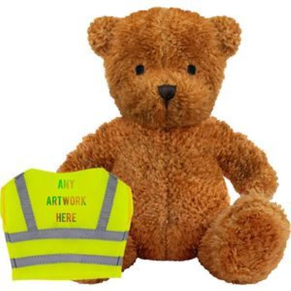 PRINTED PROMOTIONAL SOFT TOY JAMES II TEDDY BEAR with Hi-vis Vest. Branded to Your Specification & Personalised in Full Colour. James Ii Plush Toy Bear, Suitable for All Ages, Machine Embroidered Facial Features, Yellow with Silver Reflective Stripe, Seated Height 17cm Approx, Golden Colour Fur - Available in 3 Colours. Minimum Quantity: 10.