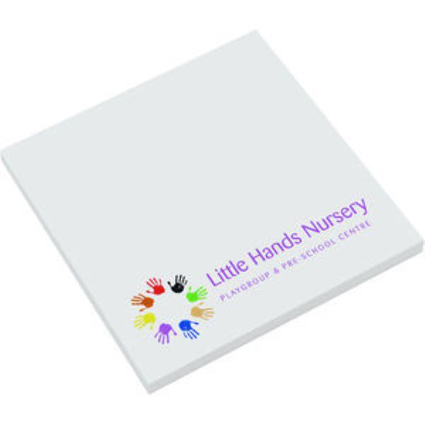 Containing 50 sheets of white 80gsm sticky paper printed to each sheet. Gummed along one edge. Bulk packed. 75 x 75mm. Standard is white paper - bright or pastel shades are an extra cost.