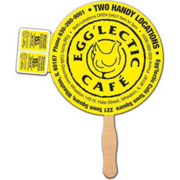 COUPON FANS (ROUND). Round-shaped coupon hand fan, perfect for branding a custom message at a sporting event, trade show, fundraiser, political or corporate event. Coupons are perforated and detach easily for follow up & measurability. Fan can be printed on both sides, but allow for a glued 20 cm wooden handle on backside of fan