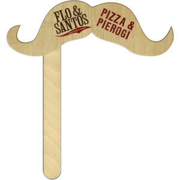 HANDLEBAR MOUSTACHE ( DIGITAL). Suitable for promotional and party events. Product is made of high density 12 pt. white paper board and liquid laminated front with a coated back. Finished with a 15-cm wooden stick. Printed in full colour on both sides.