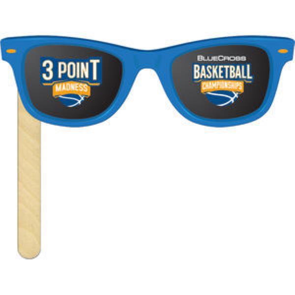 SUNGLASSES (OFFSET). Suitable for promotional and party events. Product is made of high density 14 pt. white paper board and liquid laminated front with an uncoated back. Finished with a 15-cm wooden stick.