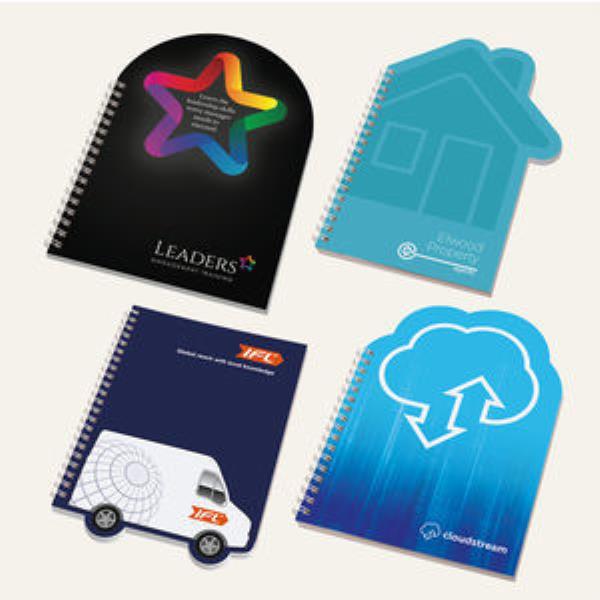 148 x 210mm. Containing 50 sheets of white 80gsm paper with a 300gsm gloss laminated card front and back cover, cut to a shape. Wiro bound on the long straight edge with white wire. Standard shapes available: house, van, semi-circle, cloud.