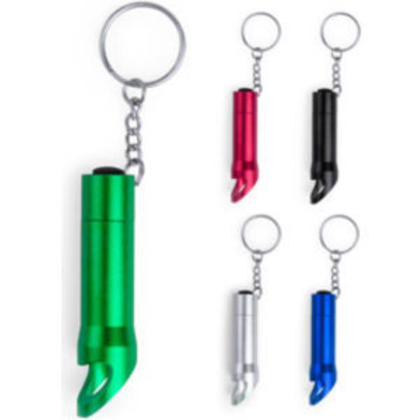 Aluminium bottle opener keyring torch with three LEDs. Button batteries included.
