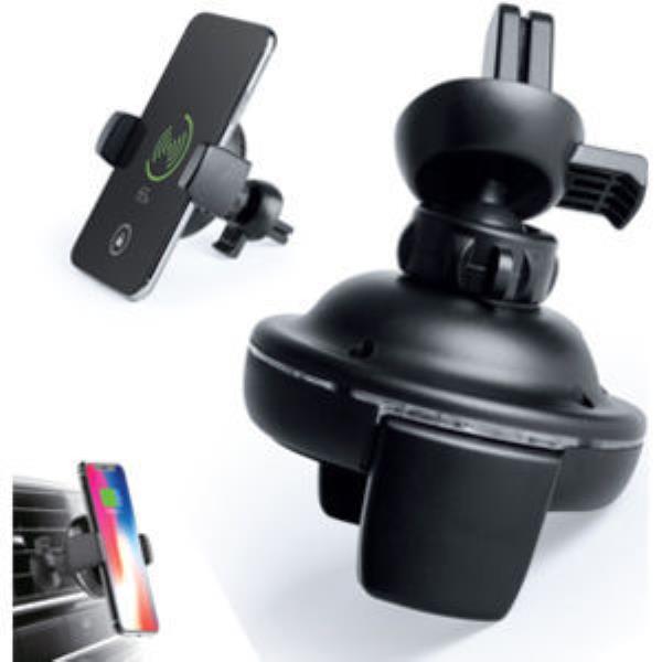 Ventilation grille smartphone holder with integrated wireless charger. In an elegant black colour design, with 360 rotation and 45 angle. Presented in an attractive design box.
