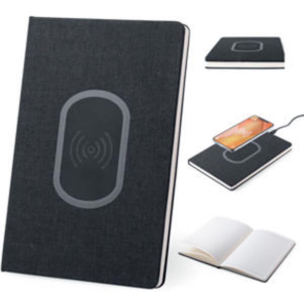 Notepad in resistant polyester 300D. Wireless charger integrated and sober design, with charging station on cover. Including 80 sheets with striped layout.