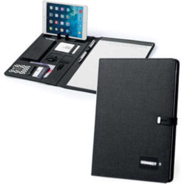 Resistant, 300D polyester folder with builtin 4,000 mAh external auxiliary battery. In sober design and with original closure, including a printing surface on the cover especially designed for laser printing, illuminating the logo. Plenty of storage compartments for business cards, USB sticks, plus a wireless charger/case for smartphones. LED charge indicators and USB output for conventional charging. Including a 20 sheet notepad and a support for mobile devices. The easy access to the charging station via micro USB cable included make of this folder the perfect gadget for business and studying. Presented in an elegant black box.