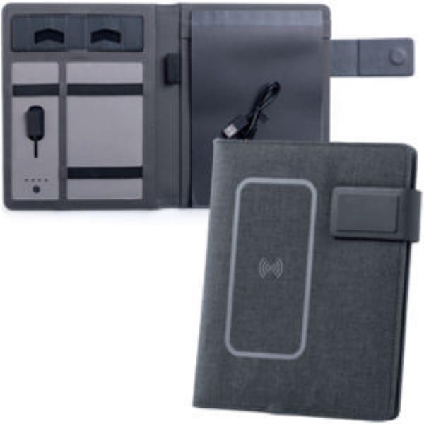 Unzipped 300D polyester folder with a builtin 4000mAh wireless power bank, suitable for devices with Qi technology and supplied with micro USB input. This folder has a magnetic flap closure with a great branding area for your customer's logo, which holds a 16GB memory stick (supplied) and is designed with a large elasticated storage area, several compartments for card, phone and USB holders a 20page notebook and a flatpack tablet stand. Perfect for keeping your educational or business items in one place.