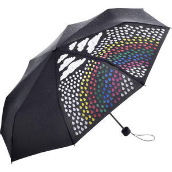 Colourful manual opening mini umbrella with surprising colour change design. Easy to handle thanks to safety runner, windproof features for higher frame flexibility and stability in windy conditions, cover with special imprint on two panels (white rain cloud motif becomes visible in dry condition, coloured rainbow-motif becomes visible in wet conditions), Soft-Touch handle with promotional labelling option. Also available as regular umbrella art. 1142C).