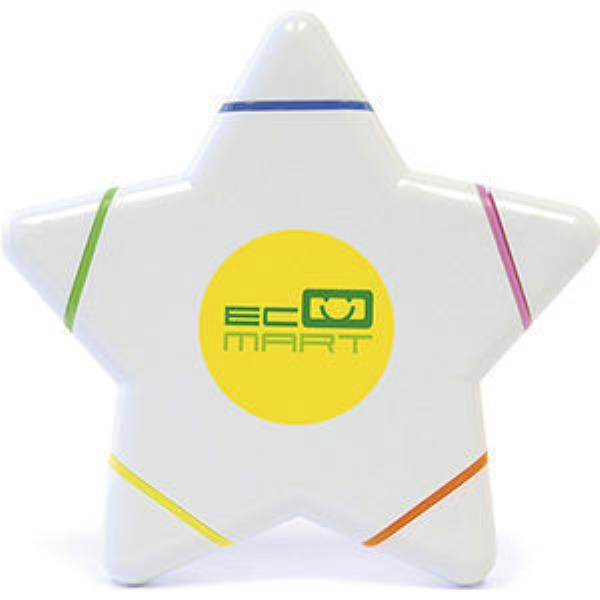 Large star shaped highlighter with 5 coloured highlighters. Blue, Green, Yellow, Orange, and Pink.