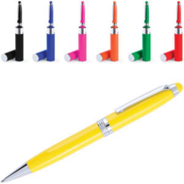 Twist action metal ballpoint pen in a tube with touch screen stylus suitable for smartphones and tablets.