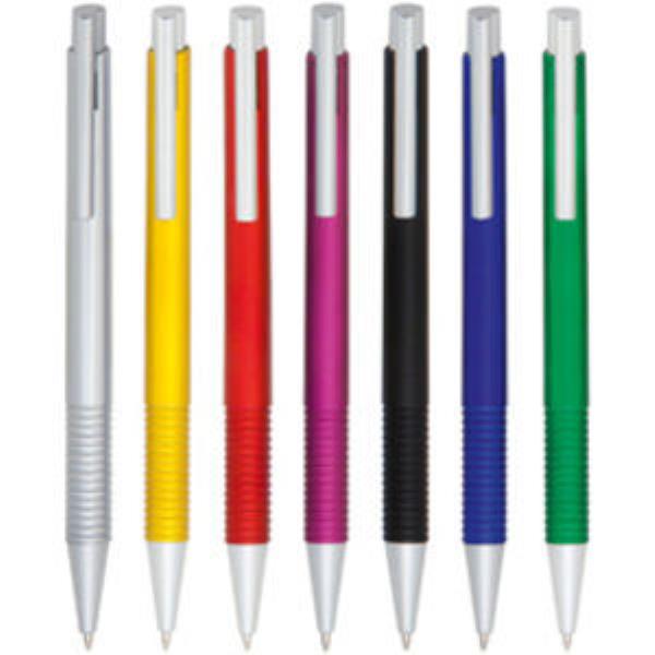 Retractable ballpoint pen with ridged grip, silver trim and blue ink.