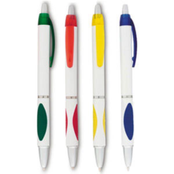 Retractable ballpoint pen with blue ink, rubber grip and silver trim.