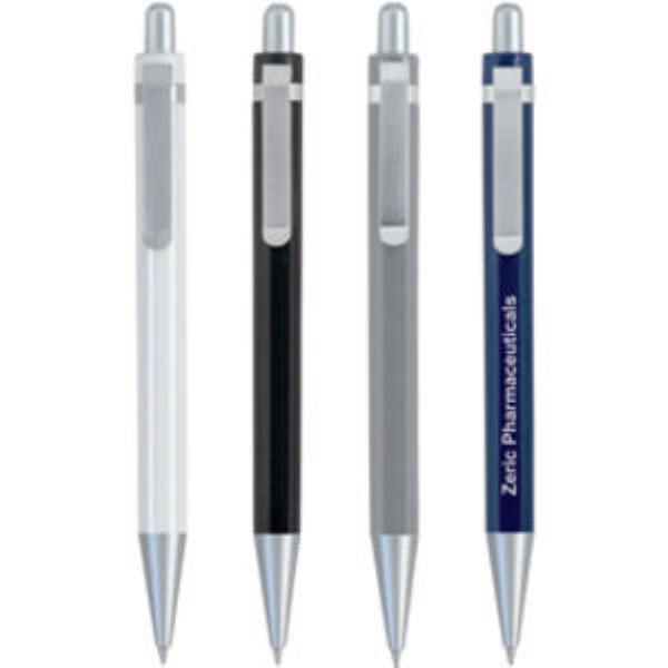 Durable retractable ballpoint pen with plastic nose cone, metal clip and coloured barrel.