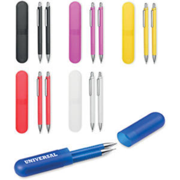 Colourful plastic ballpoint pen and mechanical pencil with matching case.