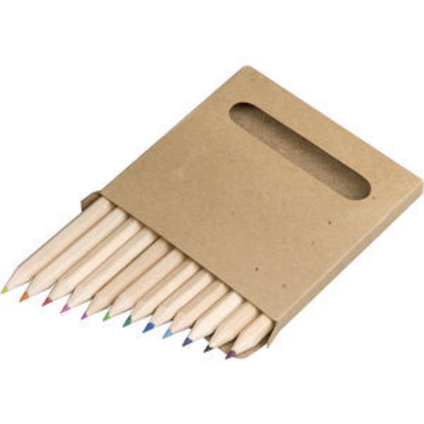 The 12 Piece Pencil Set is supplied in a carboard pack as standard, the pack can be branded up to full colour. Supplied with 12 different coloured 9cm wood pencils.