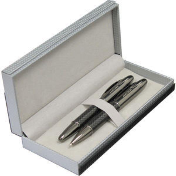 Matching stylish carbon fibre ballpen and rollerball with gun- metal cap and trim and Parker style black refills. The pen has a twist action mechanism and the rollerball a pull off cap. Presented in a deluxe hinged gift box.