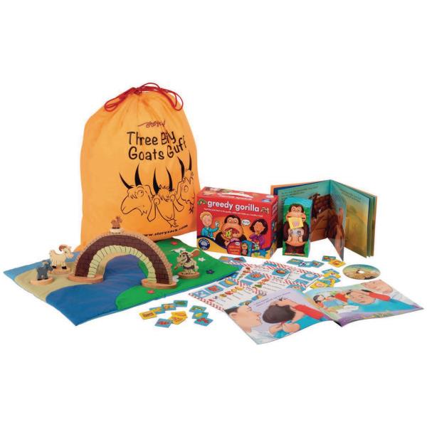 ""This traditional tale lends itself to fantastic role play and what better way to re-enact the Billy Goats Gruff “trip trapping” across the bridge than to use our exclusively designed, Fair Trade, wooden characters to create both the visual and sound effects. Are the days of the troll ruling from beneath the bridge over, at lastIncludes Three Billy Goats Gruff book and CD, Fair Trade Wooden Goats and Troll Set, River Playmat, Parent Prompt, Have Courage Book, Greedy Gorilla Game in a handy cloth sack.