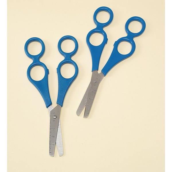 • Double loops on each handle allow teacher and child to simultaneously complete the cutting action. • Teacher uses loops closest to blade to assist with control, force or guidance. • Each. • 140mm. *Scissors have sharp edges and so when in use, children must be supervised accordingly.