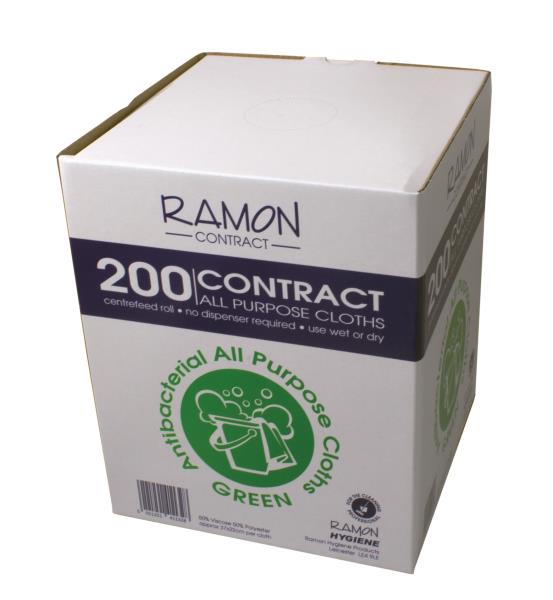 Ramon Contract box of all purpose cloths, specifically designed with the professional contract cleaner in mind. Supplied in colour coded box to help minimise the risk of cross contamination. Ideal for general cleaning tasks, this competitive cloth offers good performance, great value and can also be used wet or dry. Available in the 4 hygiene colours. Absorbent. Wet or Dry Use. Centre feed roll, no dispenser required.