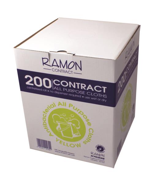 Ramon Contract box of all purpose cloths, specifically designed with the professional contract cleaner in mind. Supplied in colour coded box to help minimise the risk of cross contamination. Ideal for general cleaning tasks, this competitive cloth offers good performance, great value and can also be used wet or dry. Available in the 4 hygiene colours. Absorbent. Wet or Dry Use. Centre feed roll, no dispenser required.