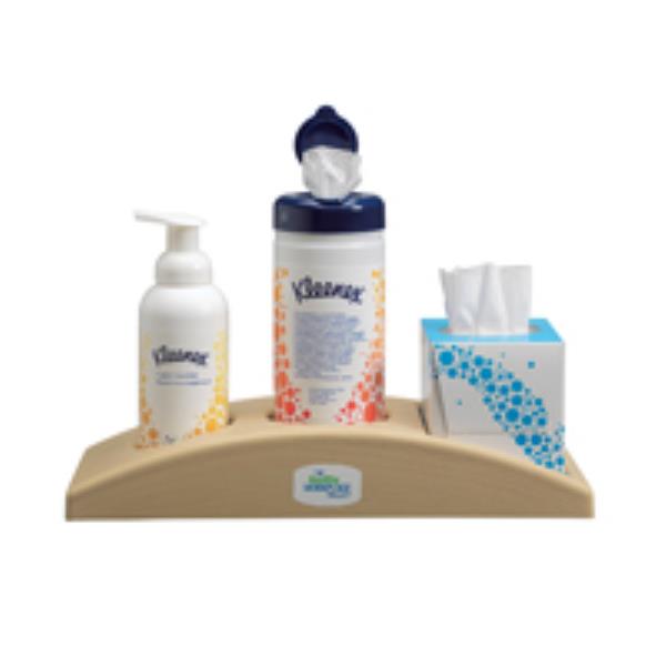 The Kimberley Clark Healthy Workplace Meeting Room Caddy holds KLEENEX+ moisturizing Instant Hand Sanitizer, Anti-Viral Facial Tissue and Disinfectant Wipes in a stylish container.